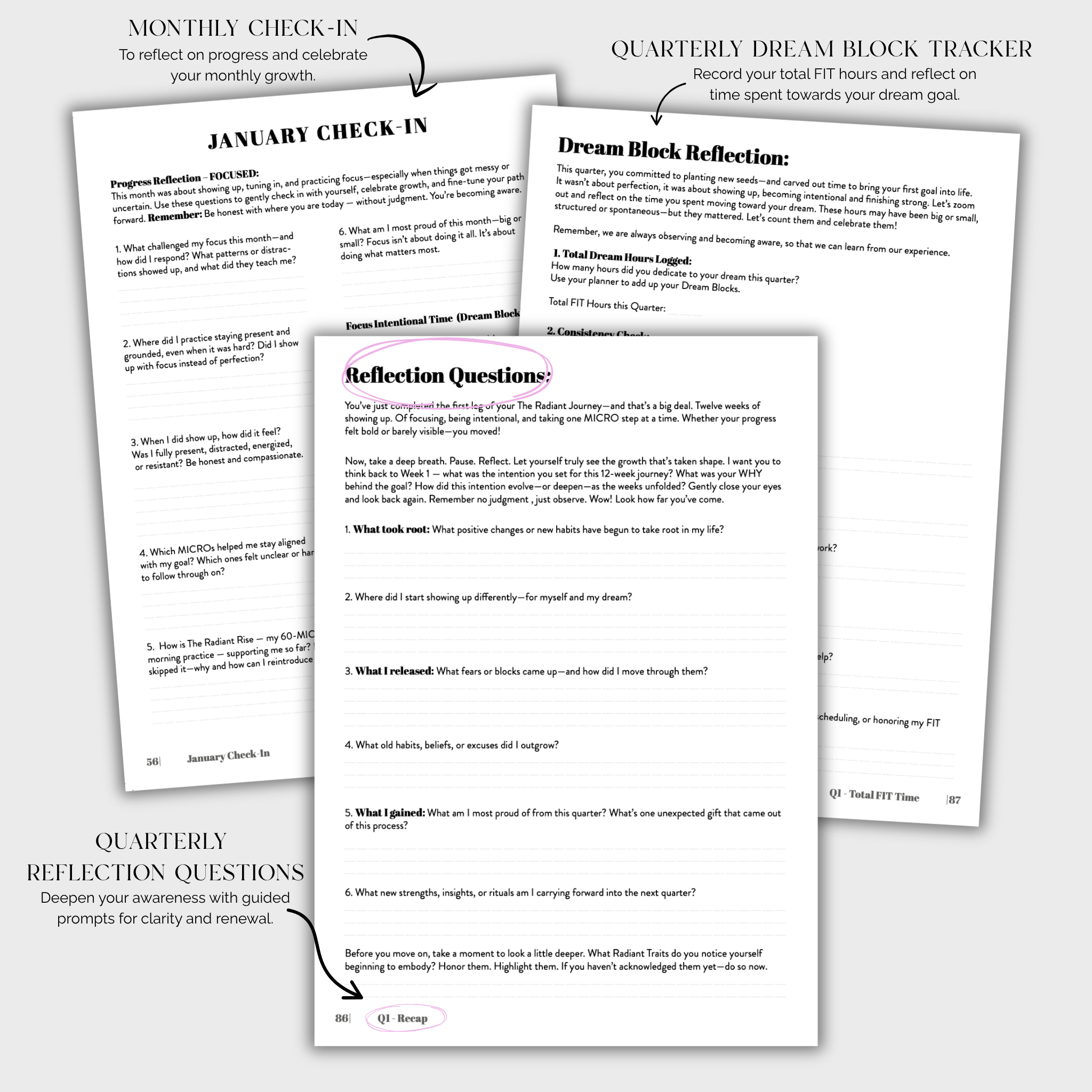 At the end of each month and quarter, you’ll be guided to pause, reflect, celebrate your growth, and realign. These reflection pages are your sacred space to look back with awareness and forward with intention — to gather the lessons, acknowledge the wins, and honor the subtle shifts that mark your evolution.